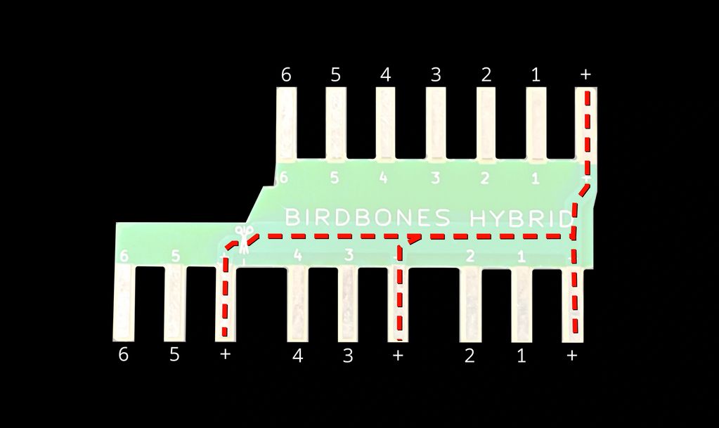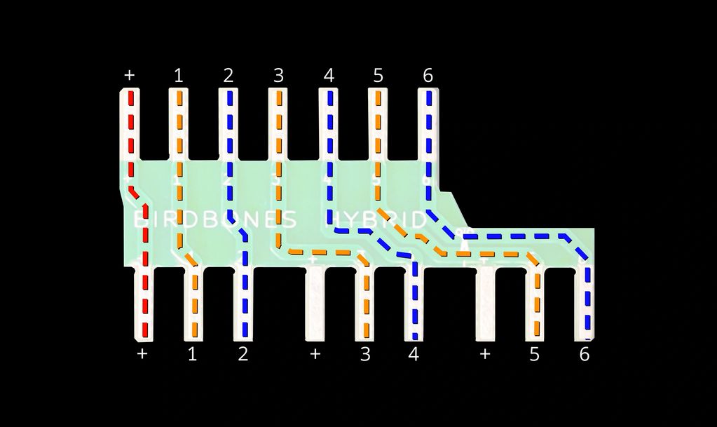 BirdBones HYBRID Trace System utilizes both sides of FR4 PCB, allowing channel and power distribution into three Hybrid set ups.